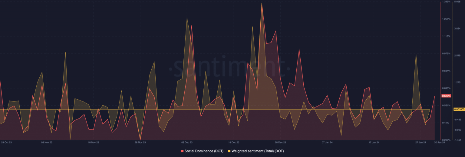 A pesar de la caída, los datos de Santiment mostraron que al DOT le estaba yendo bien en cuanto a dominio social. El dominio social mide la proporción de discusiones que tiene un proyecto en comparación con otros con una gran capitalización de mercado.