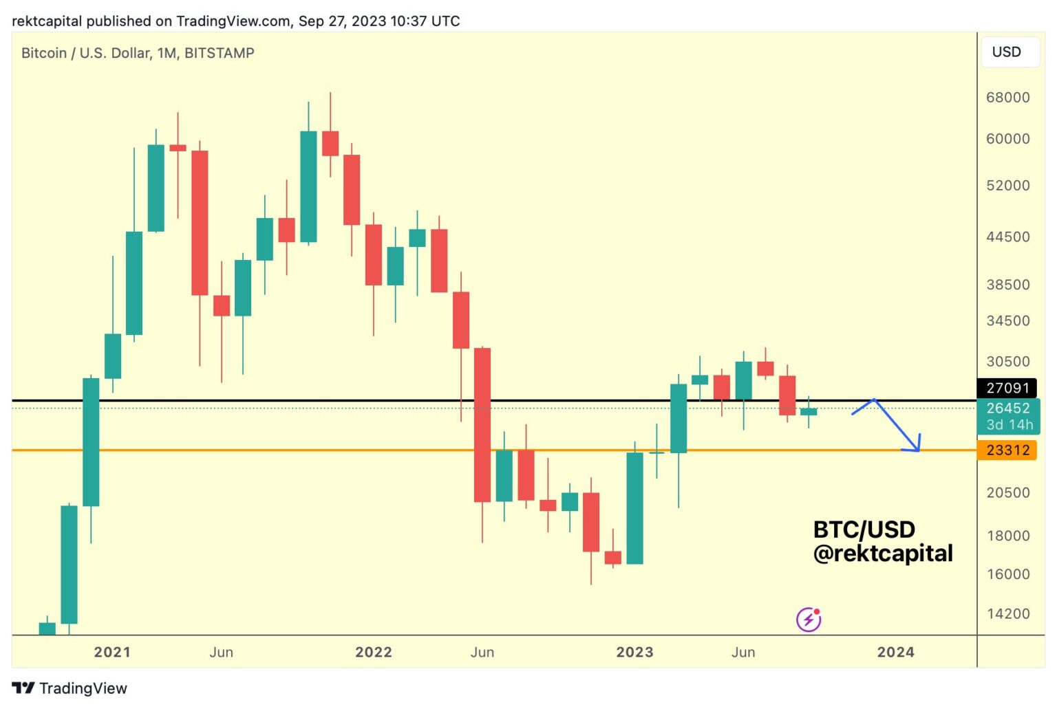 Para darle a esta declaración un contexto histórico, el mes anterior (agosto) vio un desarrollo significativo para la criptomoneda insignia. BTC registró un cierre de vela mensual bajista, terminando por debajo de aproximadamente $ 27,150. Este dato, según Rekt Capital, confirmó efectivamente que se había perdido el apoyo.
