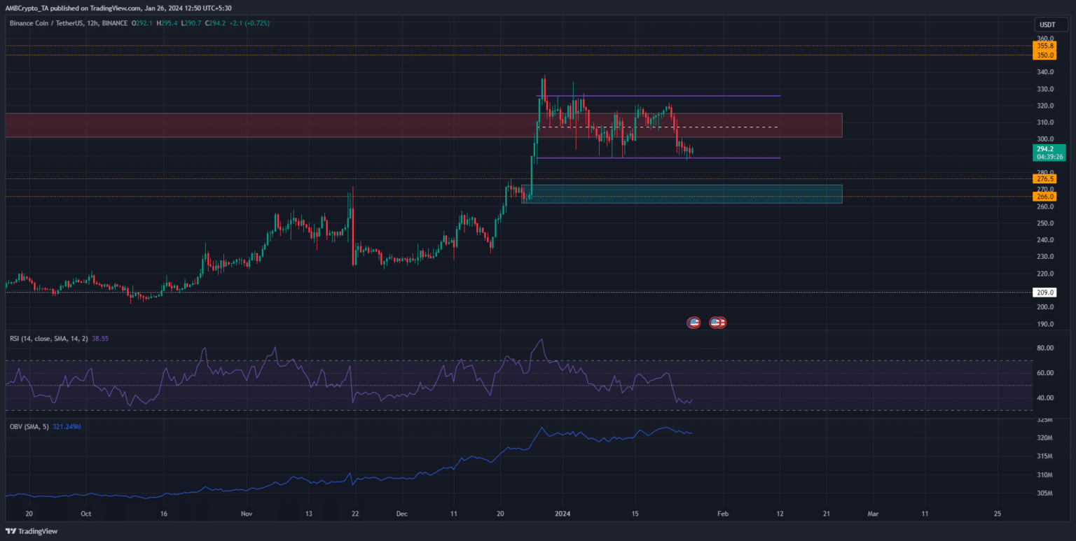 El gráfico de 12 horas de BNB destacó un rango (púrpura) que se extendía de $289 a $316. El rango medio estaba en 307, ubicado dentro de una zona de resistencia (cuadro rojo) en el gráfico semanal.