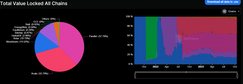 Según los datos de DeFiLlama, Parallel Finance tiene la mayor participación de TVL con más de $134 millones, lo que representa más del 34% entre las parachains. Moonbeam, que era la parachain más influyente en Polkadot, tenía un TVL de más de 51 millones de dólares, lo que la convertía en la tercera parachain más grande.