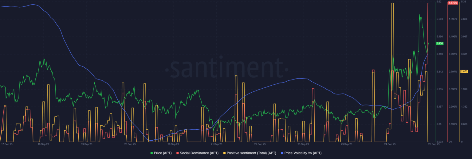 En el momento de escribir este artículo, APT cotizaba a 5,44 dólares con una capitalización de mercado de más de 1.200 millones de dólares. Gracias al aumento de precios, APTO se convirtió en la comidilla de la ciudad a medida que crecía su dominio social, al igual que su sentimiento positivo.