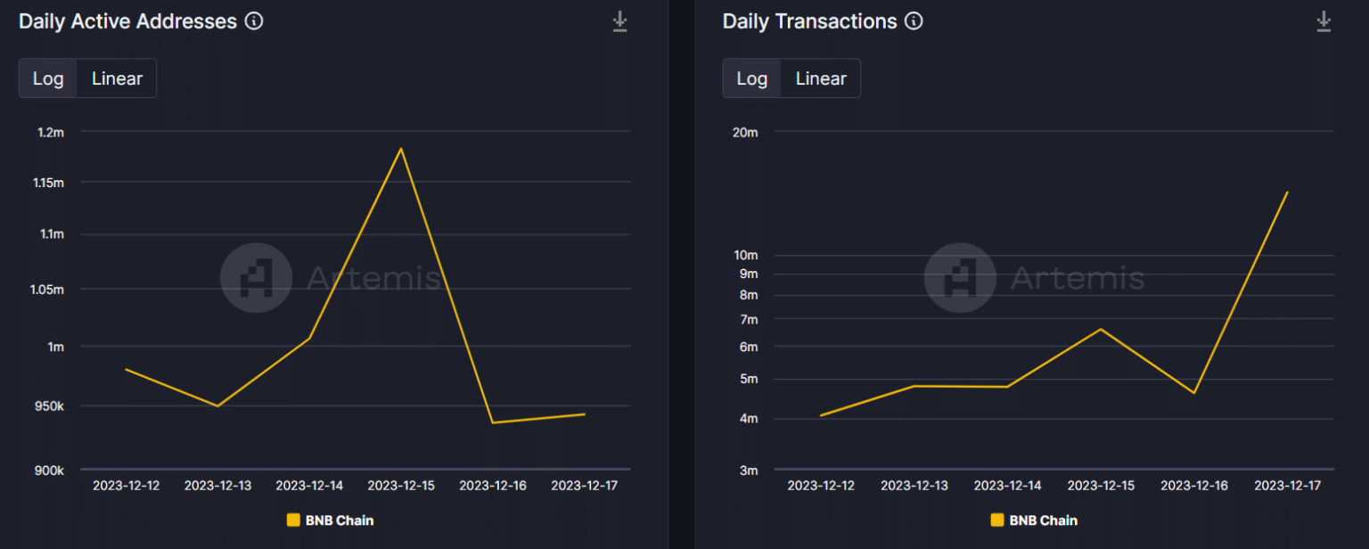 El tweet también hablaba de las transacciones en tiempo real por segundo (TPS) de opBNB, que alcanzaron 610 el 17 de diciembre. En particular, BNB Chain fue testigo de un aumento similar en la actividad de la red.