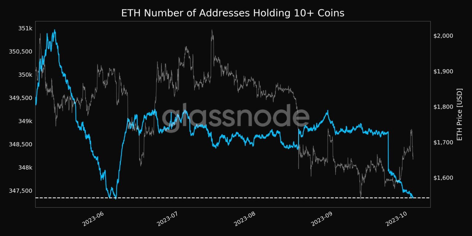 Sin embargo, los datos de Glassnode revelaron que el interés de las ballenas en Ethereum estaba disminuyendo. El número de direcciones que contienen 10 o más monedas alcanzó recientemente un mínimo de tres meses, quedando sólo 347.343 de dichas direcciones.