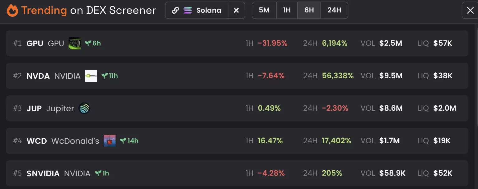 En las últimas 11 horas, el precio del token meme NVDA creció un alarmante 56.000%. Junto con eso, otros tokens como GPU y NVIDIA también crecieron enormemente en términos de precio en las últimas 24 horas.