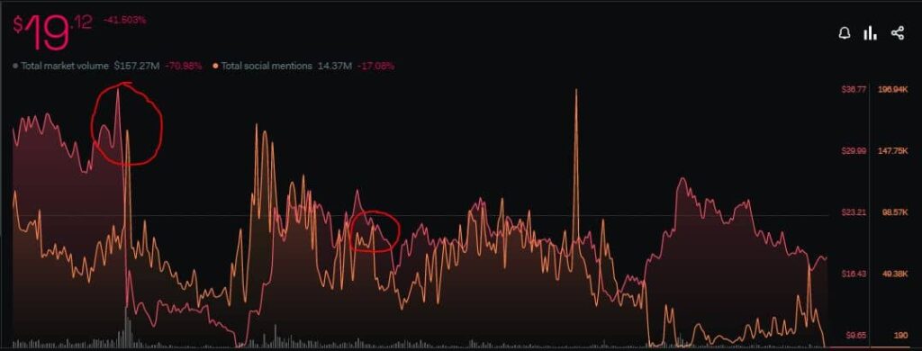 También en este caso, las menciones sociales de SOL alcanzaron nuevas alturas y los precios siguieron la dirección opuesta, como lo indican los datos de LunarCrush.