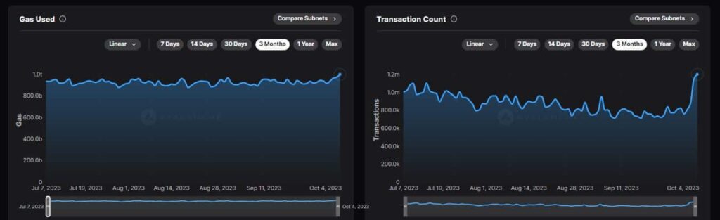Según Avalanche Explorer, las transacciones en todas las subredes aumentaron casi un 50% desde el comienzo de la semana. De hecho, el recuento diario del 4 de octubre alcanzó los 1,2 millones, el mayor en cuatro meses. Con el aumento de las transacciones, el consumo de gas también se disparó