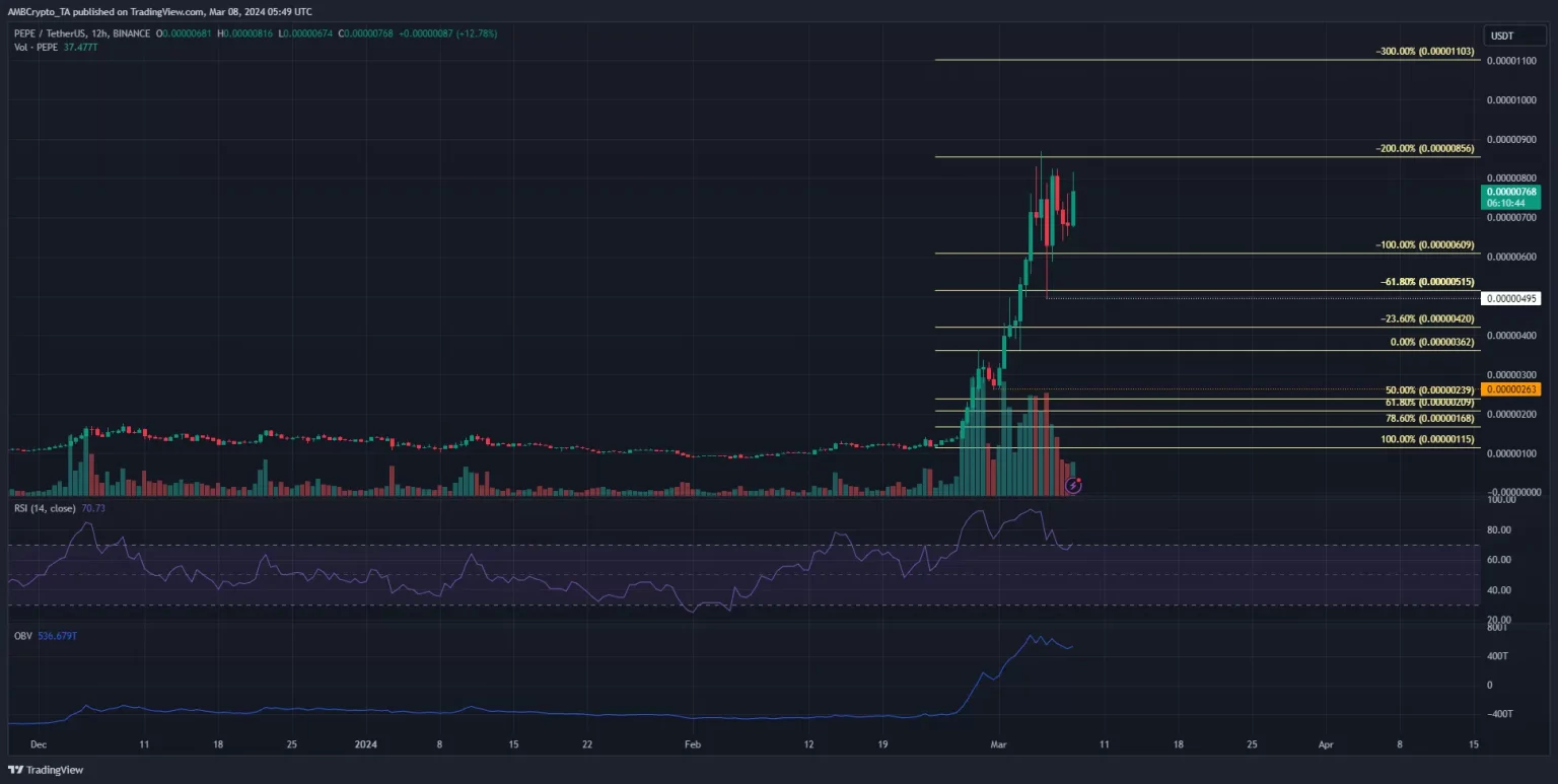 Pepe [PEPE] experimentó un fuerte retroceso el 5 de marzo junto con el resto del mercado de cifrado. bitcóin [BTC] alcanzó su ATH en USD de 69.000 dólares ese día y cayó a un mínimo de 59.000 dólares apenas unas horas después.