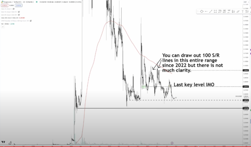 “[DOGE] volvió a este último nivel clave en $ 0,057. Esta es un área interesante, pero, nuevamente, no creo que sea necesariamente una compra. Puedes simplemente sentarte aquí y comprarlo, pero espera que esto simplemente se reduzca…
