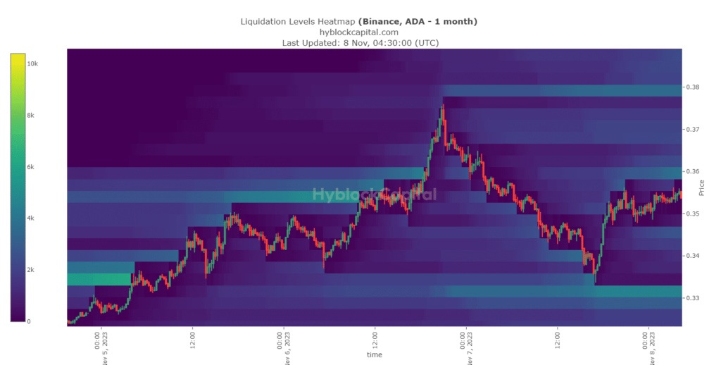 Según el gráfico, la liquidación de Cardano aumentó el 6 de noviembre de 2023, cuando el precio del token alcanzó los 0,37 dólares.