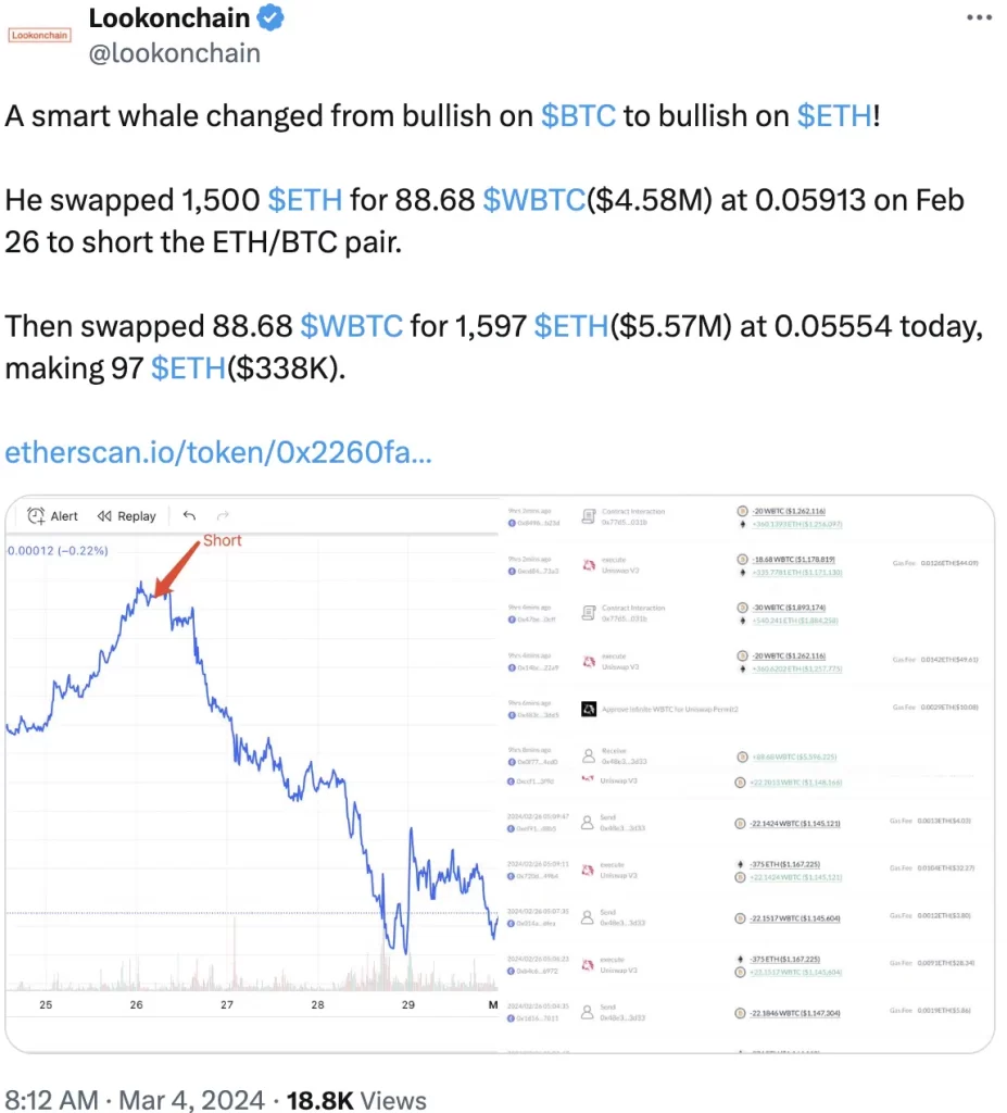 Este cambio estratégico implicó intercambiar 1.500 ETH por 88,68 WBTC, por un total de 4,58 millones de dólares el 26 de febrero, con la intención de vender en corto el par ETH/BTC.