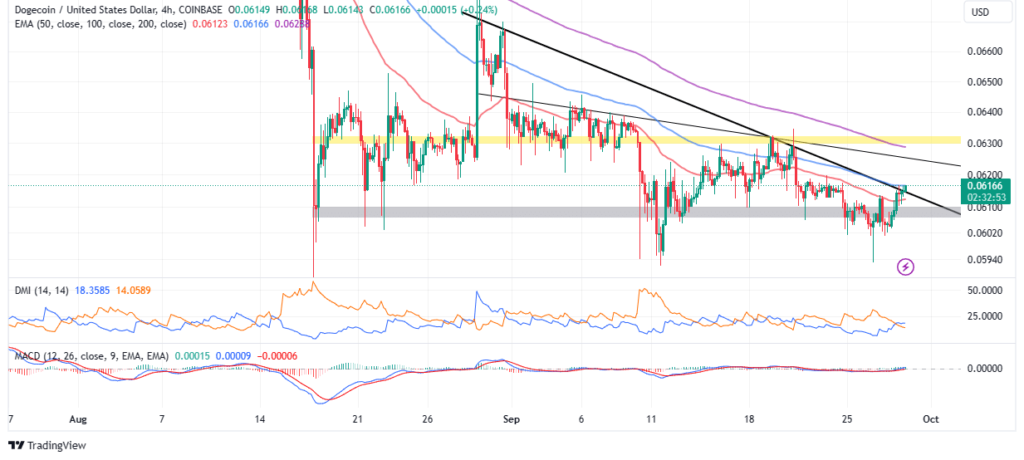 El precio de Dogecoin ha estabilizado la tendencia alcista tras el soporte de 0,06$ para cotizar por encima de niveles clave comenzando con la media móvil exponencial (EMA) de 50 días (rojo) en 0,0612$ y una línea de tendencia descendente de un mes.