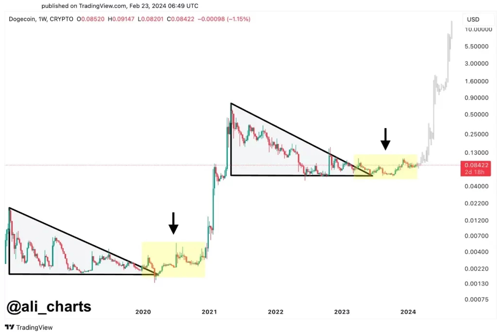 La publicación de Ali sugirió que Dogecoin estaba en una fase de consolidación. El repunte de 2021 estuvo precedido por un patrón similar. AMBCrypto profundizó más en el gráfico semanal de TradingView para comprender cuándo y hasta dónde podría recuperarse DOGE.