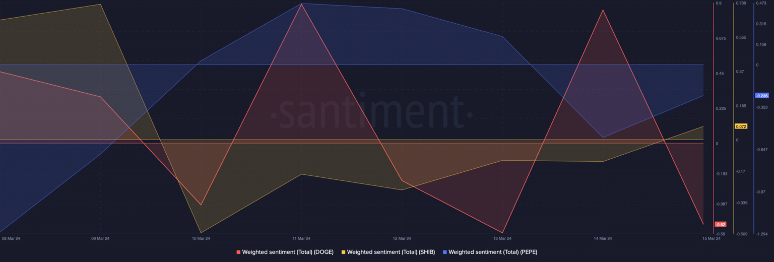 Como estas acciones de precios fueron bajistas, AMBCrypto analizó el sentimiento del mercado en torno a estas monedas meme. Nuestro análisis de los datos de Santiment reveló que los gráficos de sentimiento ponderados de DOGE y PEPE se mantuvieron en la zona negativa.