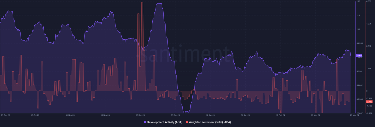 Sin embargo, el regreso de los desarrolladores por sí solo podría no ser suficiente para cambiar las perspectivas de los participantes. El precio de ADA es otra área que los actores del mercado podrían estar analizando.