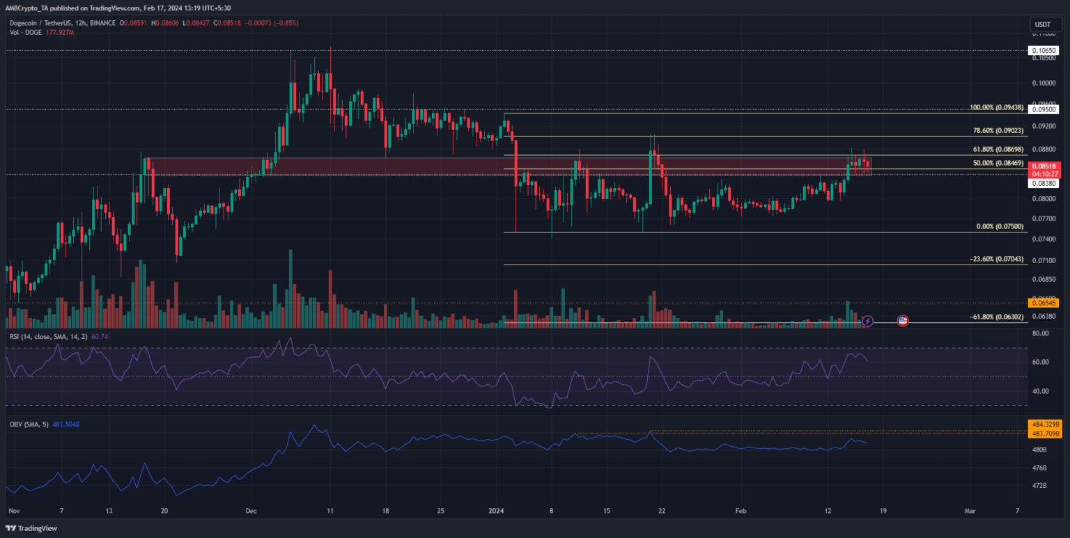 DOGE tiene un sesgo alcista según el gráfico de precios de 12 horas, pero enfrentó resistencia desde un nivel de retroceso de Fibonacci. ¿Podrían los alcistas lograr una ruptura pronto?