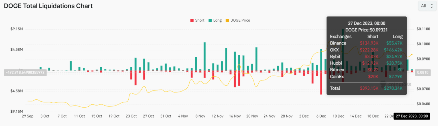 Pero el mercado de derivados revela cierta recogida de beneficios. Según datos de Coinglass, Dogecoin muestra una disminución del 29% en volumen y se sitúa en 735 millones de dólares. Con cierto aumento en el interés abierto, la relación largo/corto se sitúa en 0,9677. Esto significa que hay un poco más de cuentas con posiciones cortas que con posiciones largas en Dogecoin, pero en general, es un mercado neutral.