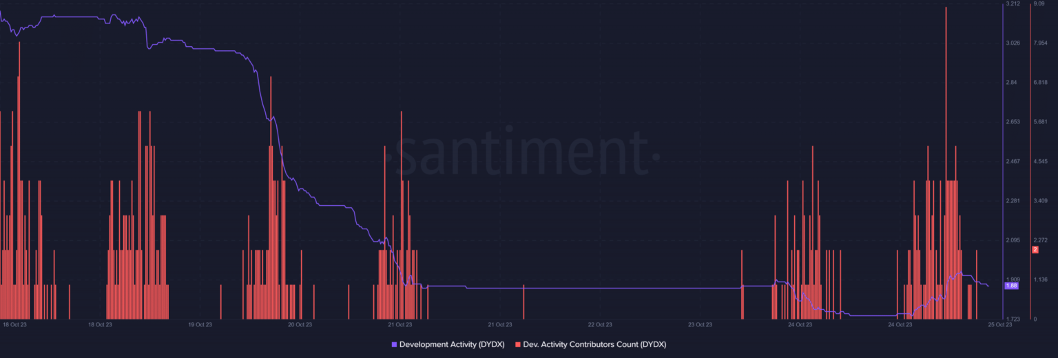 dYdX [DYDX] registró un repunte prometedor en los últimos días, gracias al actual mercado alcista. A medida que el precio del token subió, la actividad de desarrollo a su alrededor también aumentó sustancialmente, ya que dYdX obtuvo una puntuación de 211 el 24 de octubre.