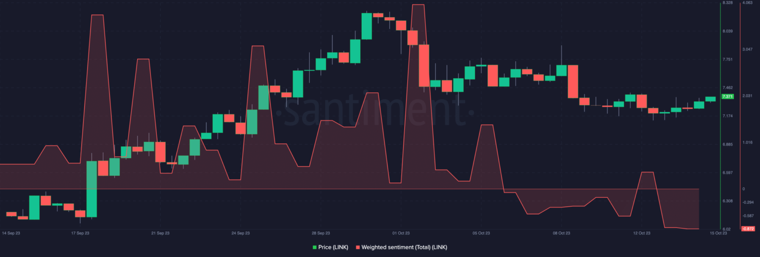 Esto también fue evidente en el Sentimiento ponderado. Al momento de escribir este artículo, el sentimiento ponderado de Chainlink era -0,872. El sentimiento ponderado mide el volumen social único relacionado con un activo.
