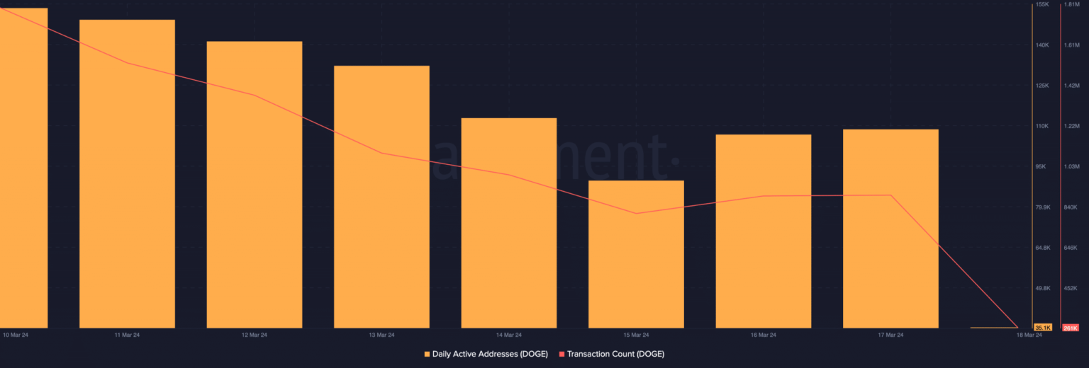 El análisis de AMBCrypto de los datos de Santiment reveló que las direcciones activas diarias de la moneda meme cayeron la semana pasada. Su recuento de transacciones también disminuyó, lo que refleja un menor interés de los inversores en comercializar la moneda.