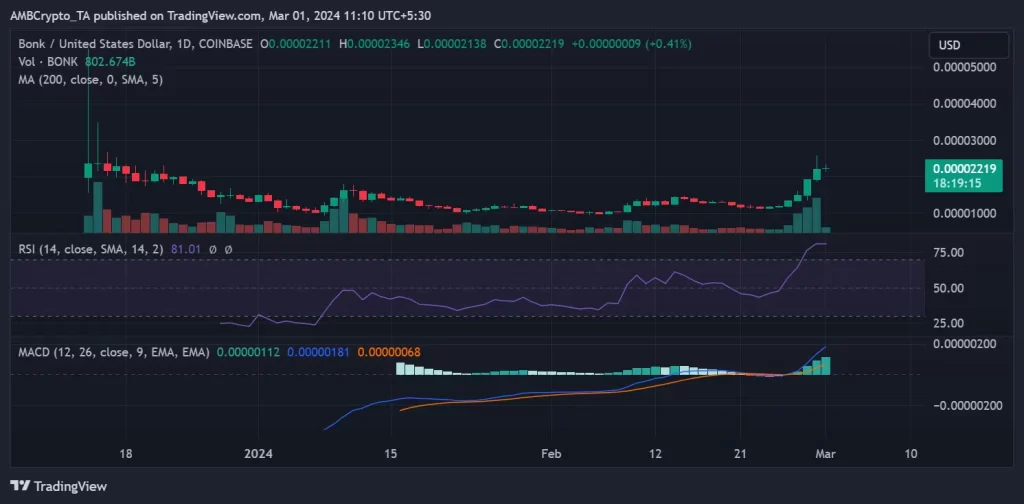Un examen de BONK en un gráfico de tiempo diario revela una tendencia alcista constante durante los últimos siete días. Cabe destacar que en cuatro de los últimos siete días experimentó aumentos consecutivos de dos dígitos.