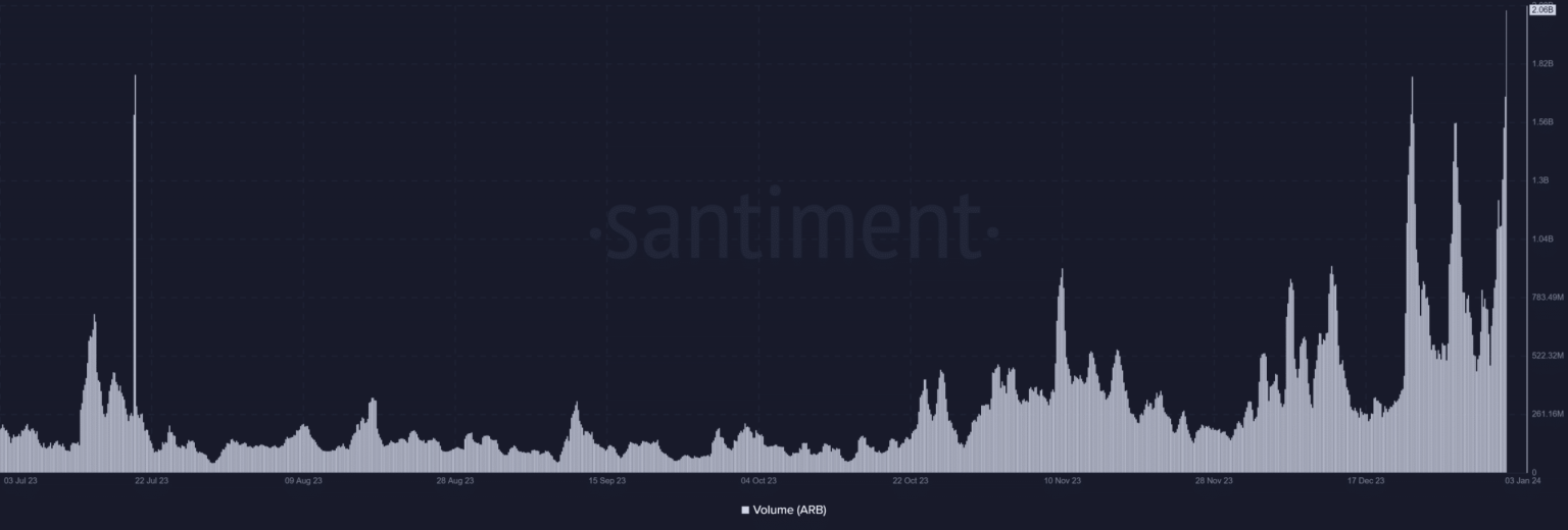 Arbitrum ha sido testigo de un aumento notable en el volumen de operaciones, con un aumento particularmente significativo en los últimos tres días. El análisis del gráfico de volumen de Santiment mostró que el volumen de ARB rondaba los 1.300 millones de dólares el 2 de enero.
