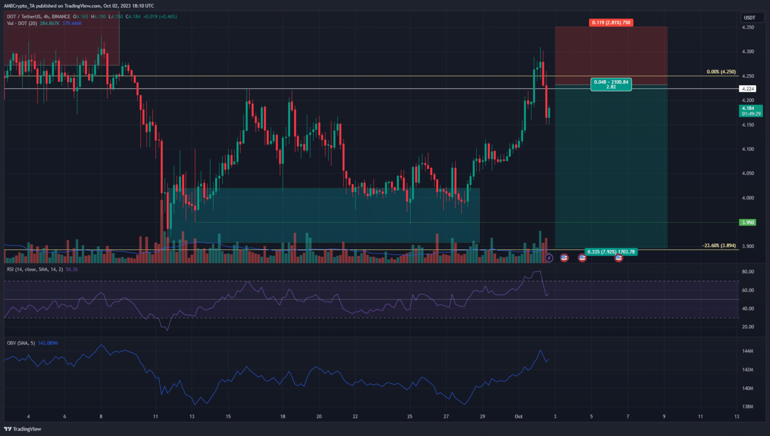 - Polkadot tiene una estructura alcista en el gráfico de una y cuatro horas, pero esto podría cambiar pronto