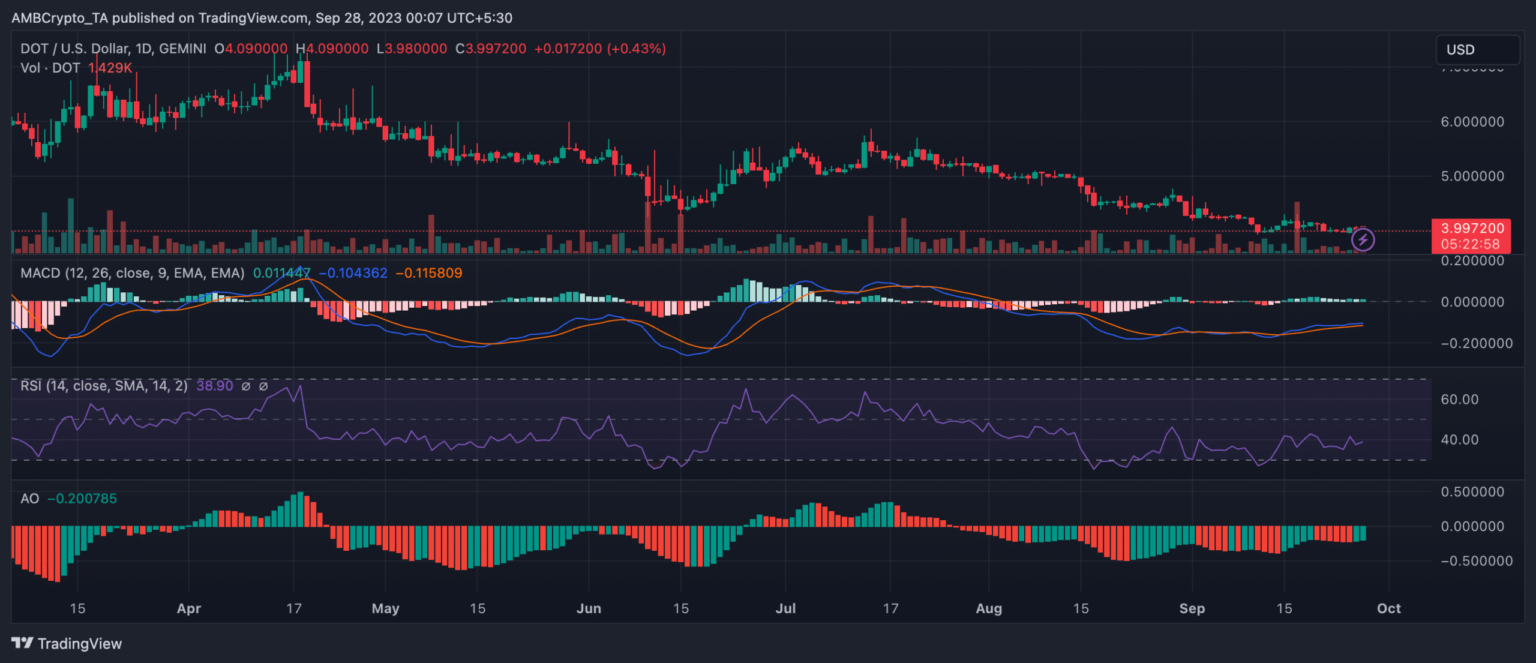 Si bien esto no fue lo suficientemente significativo, podría considerarse un comienzo. Además, una mirada a las barras verdes parpadeantes del Awesome Oscillator (AO) contribuyó a la reactivación del sentimiento alcista hacia el DOT. Además, la divergencia de convergencia de la media móvil (MACD) confirmó la reaparición del sentimiento alcista reducido pero esperanzador.