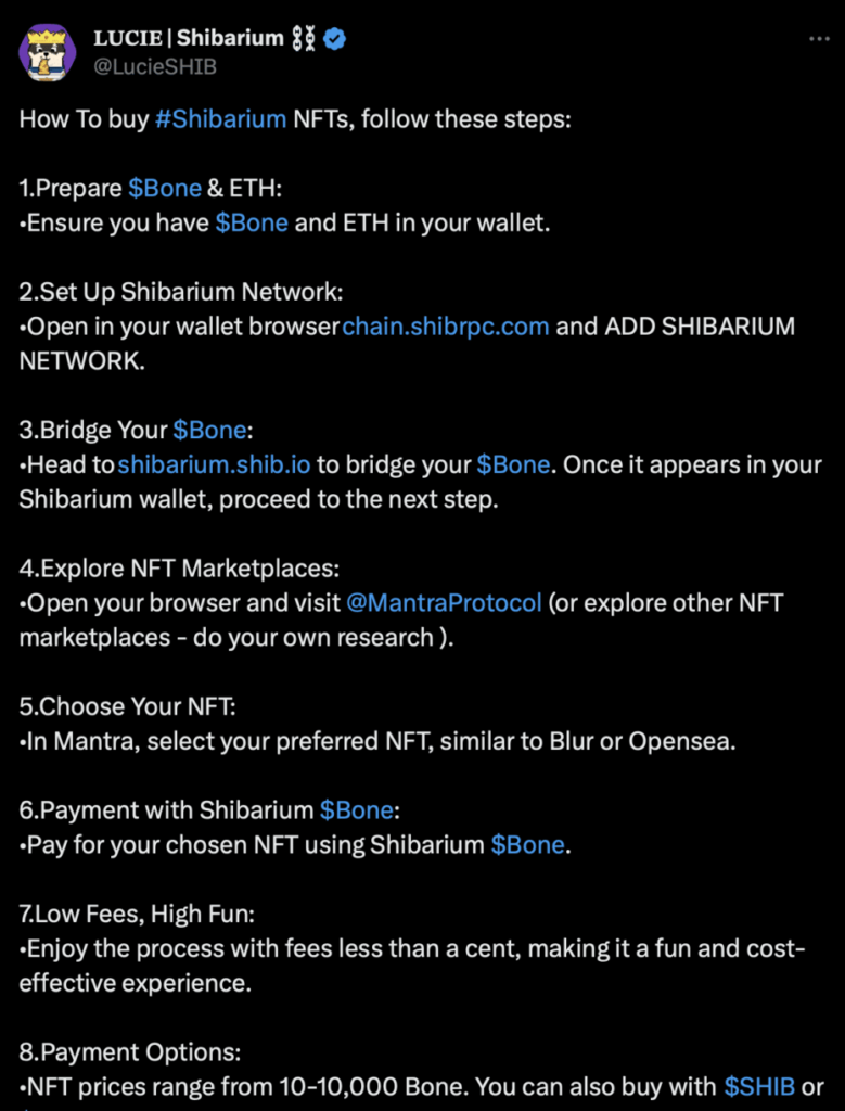 A medida que se intensifica el rumor en torno a las NFT basadas en Shibarium, un miembro del ecosistema Shiba Inu, que se conoce con el apodo de “Lucie” en X, compartió una guía paso a paso en la plataforma de redes sociales, explicando a los miembros de la comunidad Shiba Inu cómo puede comprar estos activos digitales.