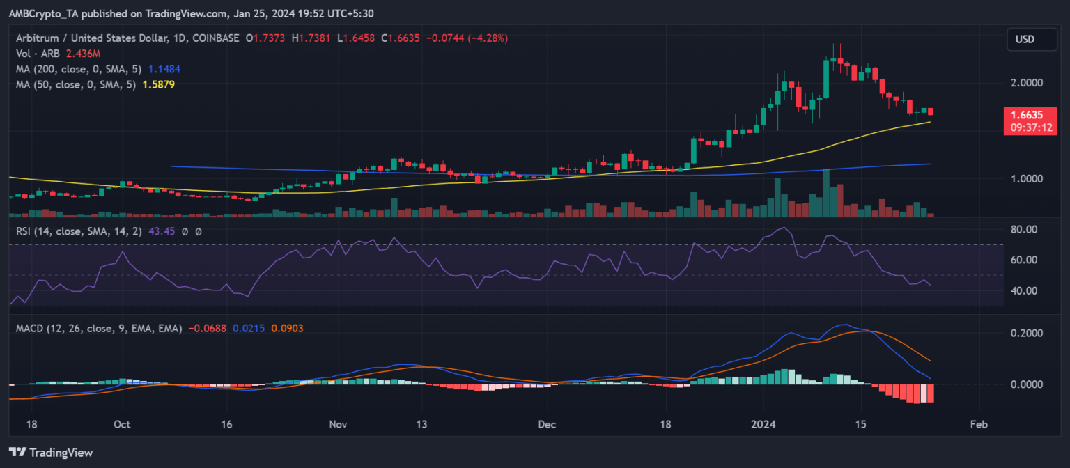 En el gráfico diario de Arbitrum, se observó un breve respiro de su caída el 24 de enero, durante el cual añadió alrededor de un 2,8% en valor.