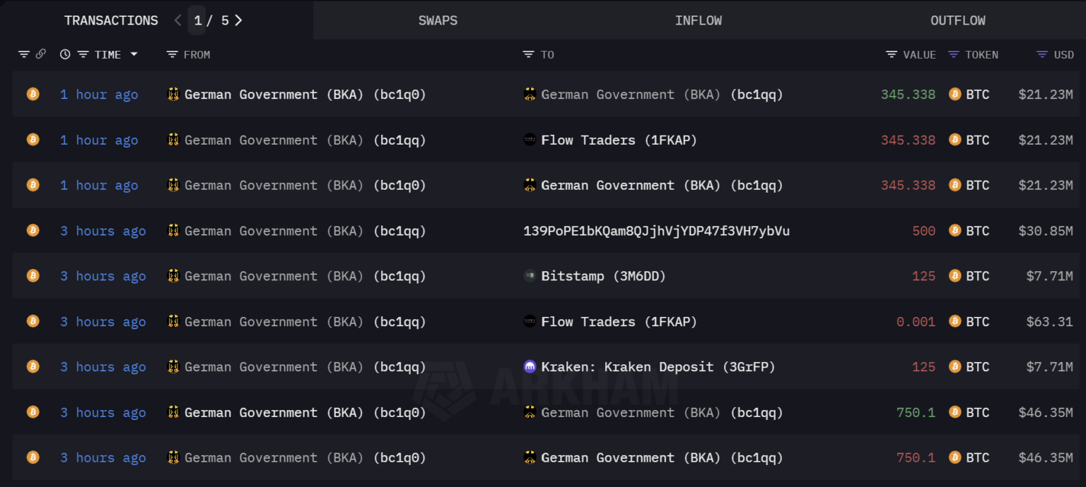 Los datos de Arkham Intel muestran que cuatro de ellas son transferencias internas, mientras que cinco transacciones fueron transferencias directas a intercambios de cifrado y creadores de mercado, lo que sugiere una intención de venta. Las cinco ventas potenciales ascienden a 1.095.339 BTC por un valor aproximado de 67 millones de dólares. Específicamente, la BKA realizó dos transferencias de 125 BTC, cada una por un valor aproximado de $7,7 millones, a los conocidos intercambios de criptomonedas Bitstamp y Kraken.