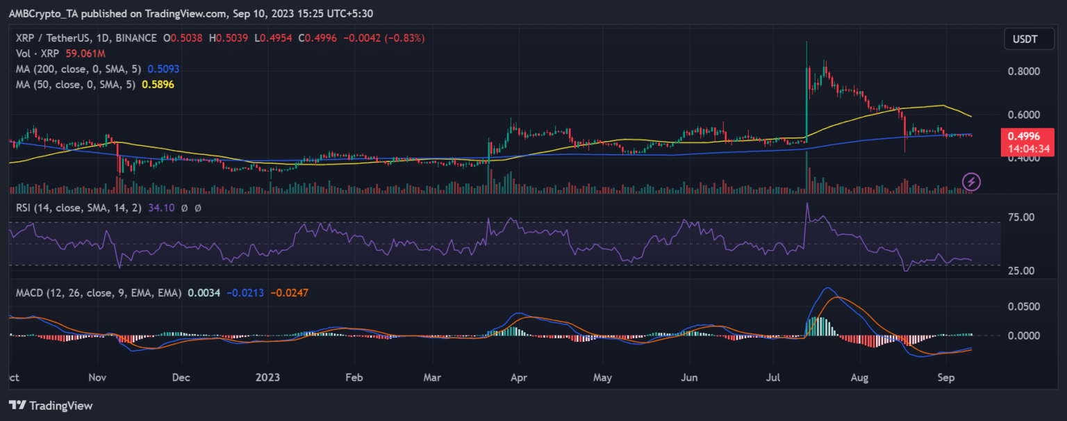 A pesar de los acontecimientos recientes, la tendencia de precios de Ripple (XRP) se ha mantenido relativamente estancada. Un examen más detenido del gráfico de tiempo diario reveló que XRP ha estado experimentando caídas menores en los últimos días. En el momento de escribir este artículo, se cotizaba a aproximadamente 0,49 dólares, lo que refleja una disminución de casi el 1% en el precio.