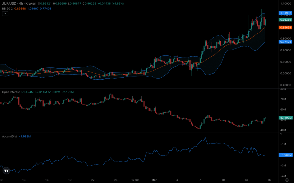 Desde una perspectiva técnica, el gráfico de 4 horas mostró que la volatilidad en torno al token era alta. En este caso, el precio del JUP podría superar el dólar.
