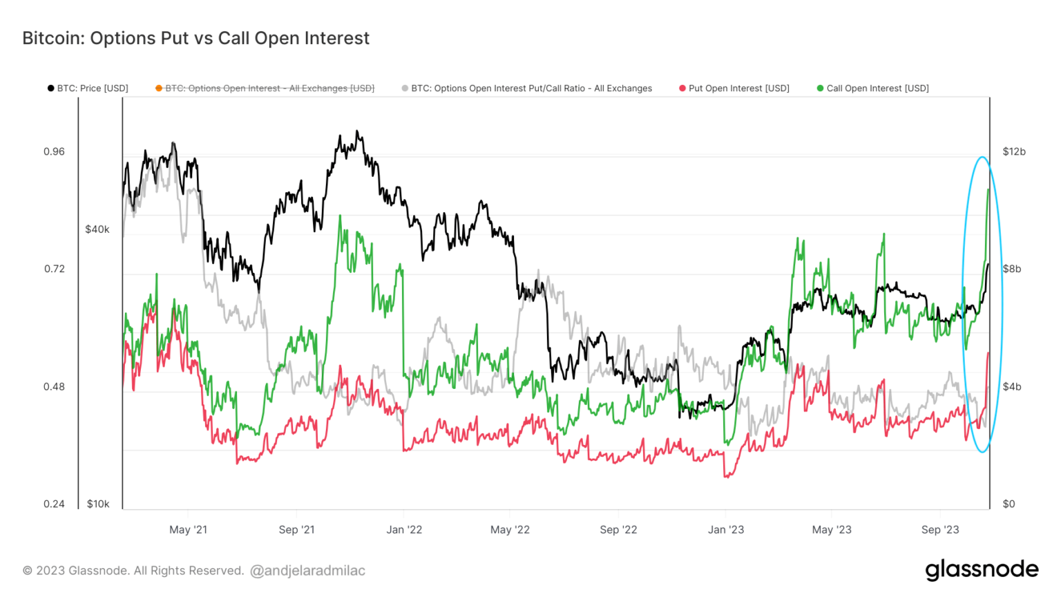Del 18 al 25 de octubre, el ratio put/call disminuyó de 0,538 a 0,475. Esto indica un cambio hacia un sentimiento aún más alcista durante este período. El volumen tanto de opciones de venta como de opciones de compra aumentó significativamente, pero el volumen de llamadas experimentó un aumento más pronunciado, alcanzando el mayor en la historia de Bitcoin, al igual que el interés abierto de las opciones de compra. El volumen récord de llamadas del 25 de octubre sugiere un día particularmente activo y alcista en el mercado de opciones de Bitcoin.