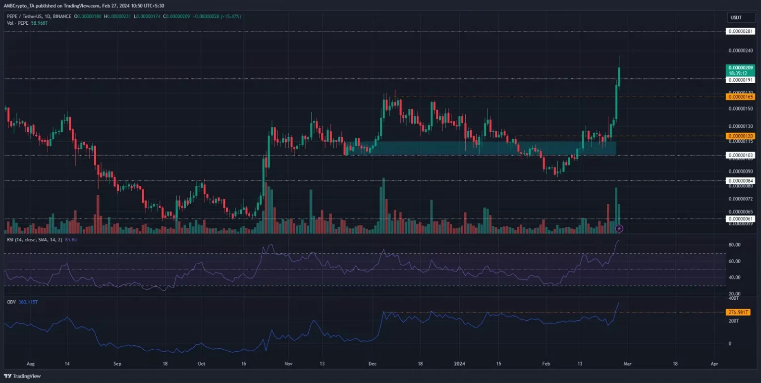 El OBV logró superar los máximos registrados en diciembre. Esta fue una fuerte señal de que el PEPE probablemente continuaría subiendo. Sin embargo, no descarta la posibilidad de un retroceso al soporte de $0.00000165.