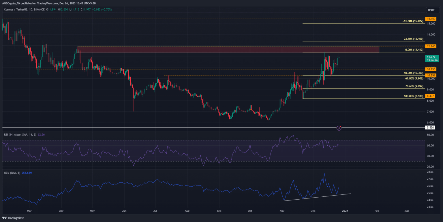 El bloque de órdenes bajistas entre 12,4 y 12,95 dólares ha presentado un gran obstáculo para los alcistas de ATOM en diciembre. La estructura alcista significaba que era probable un movimiento alcista. El RSI estaba en 62, lo que muestra un fuerte impulso alcista en el período D1.