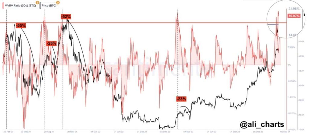 Citando datos de Santiment, el renombrado analista criptográfico Ali Martínez emite una nota de advertencia con respecto al indicador MVRV (valor de mercado a valor realizado) de Bitcoin, que actualmente se sitúa en 19,57%. Martínez destaca un patrón histórico preocupante, afirmando que cada vez que el indicador MVRV superó el umbral del 18% desde febrero de 2021, el precio de Bitcoin se desplomó entre un 24% y un 55%.
