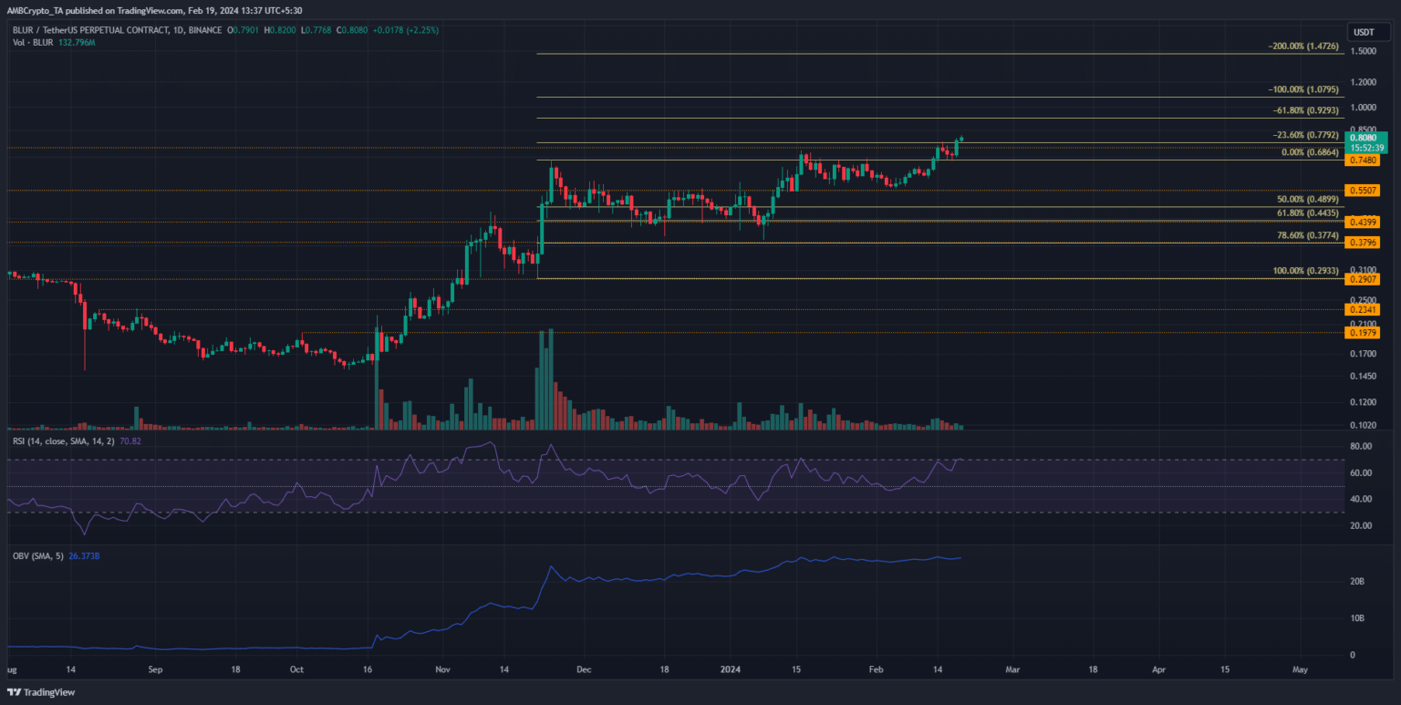 Difuminar [BLUR] estuvo en una fuerte tendencia alcista en las últimas semanas, subiendo un 110% desde el 8 de enero. También mostró una estructura de mercado alcista ininterrumpida en el gráfico de un día.
