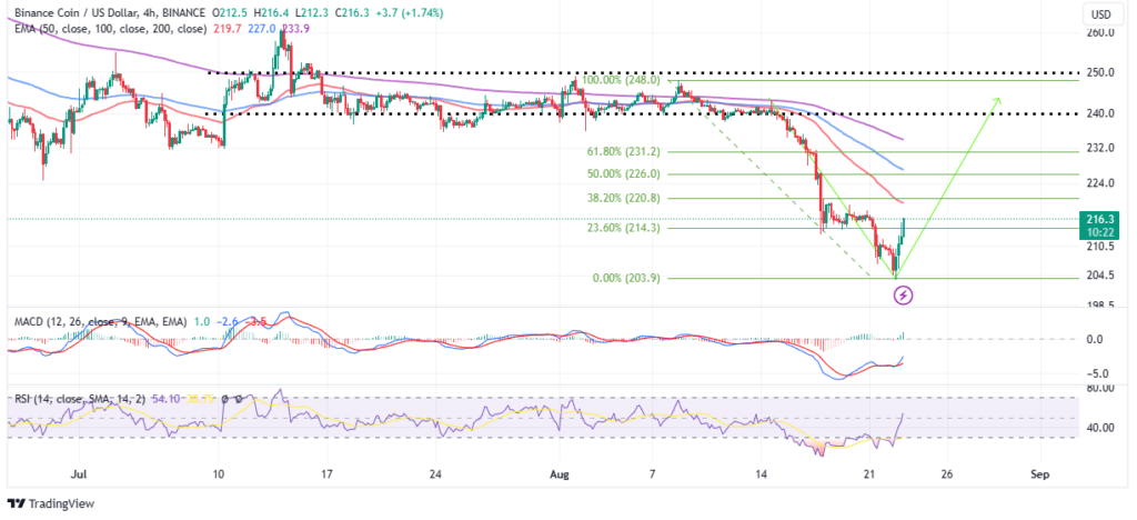 El gráfico de cuatro horas muestra un impulso de recuperación dentro de un patrón en forma de V. Indicadores como la divergencia de convergencia de la media móvil (MACD) tienen una perspectiva positiva que los alcistas podrían aprovechar para sostener la recuperación.