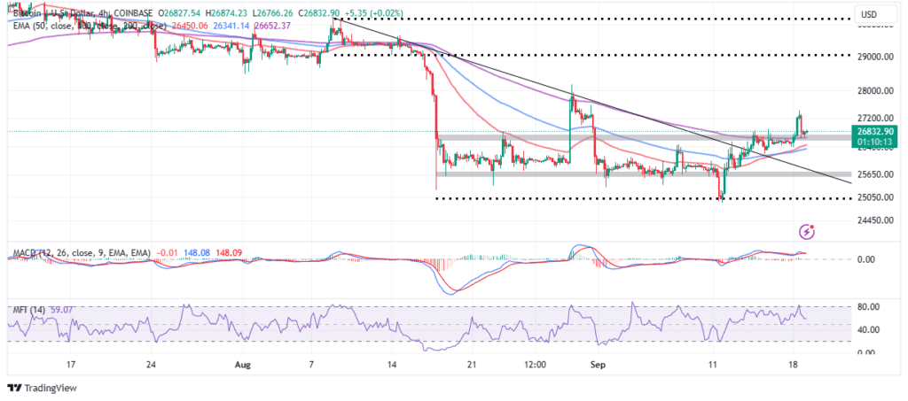 El precio de BTC respetó el fractal bajista como se analizó en el análisis de precios anterior. Debido a la congestión de vendedores en $27,200, el precio de Bitcoin cayó por debajo de $27,000 de soporte/resistencia y actualmente se cotiza a $26,830.