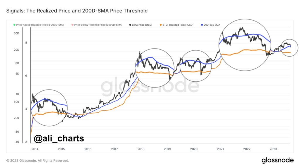 Los indicadores en cadena y la configuración técnica muestran que el precio de BTC podría bajar aún más a medida que el precio cae por debajo del promedio móvil de 200 días. Popular analista del criptomercado Ali Martinez explica: “Cada vez $ BTC ha roto por debajo de la SMA de 200 días en los últimos 10 años, a menudo cae hasta tocar el precio realizado. En este momento, el precio realizado es de alrededor de $20,350″.
