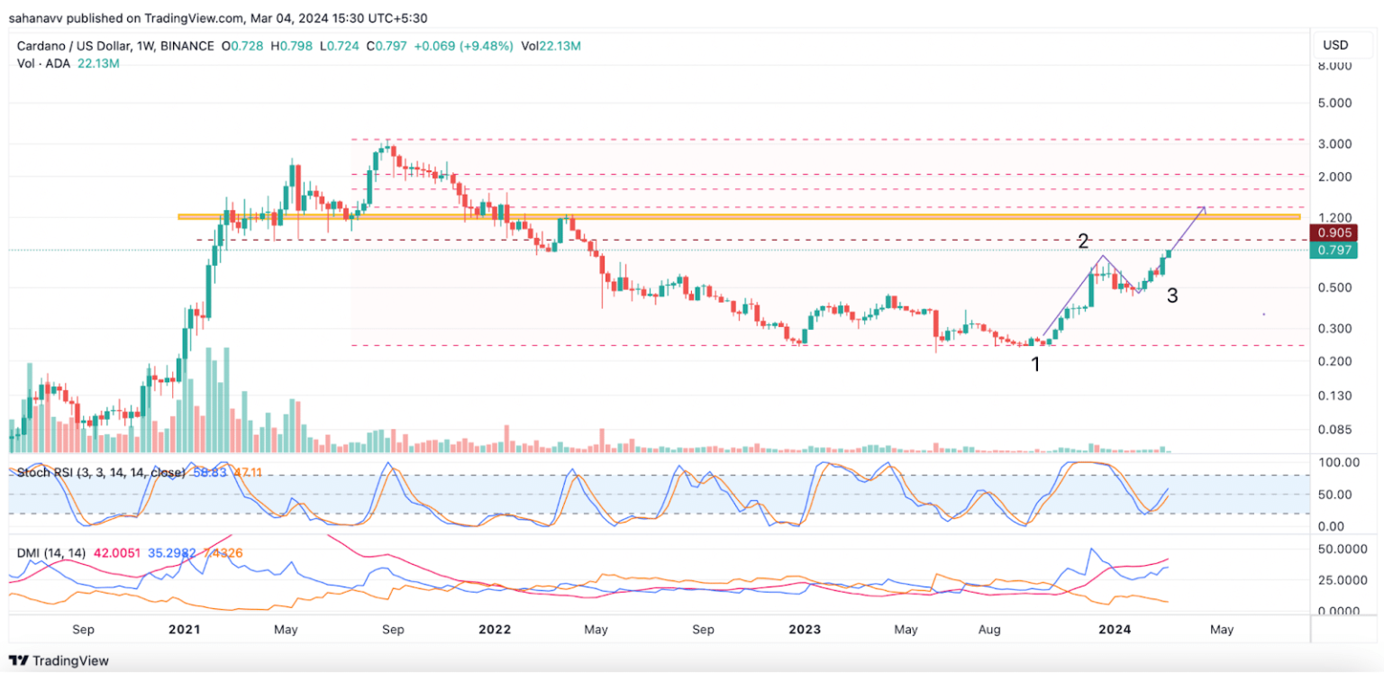 Cardano parece estar siguiendo un patrón de onda de Elliot, con el potencial de superar el nivel de resistencia crucial de 0,8 dólares y apuntar a 0,9 dólares en las próximas semanas. El reciente rebote desde los mínimos se alinea con la tercera onda de la teoría de la onda de Elliot, lo que indica un movimiento hacia máximos locales. El RSI estocástico semanal está aumentando, lo que indica un mayor impulso alcista, mientras que la tendencia alcista está respaldada por el DMI a medida que los niveles +Di y -Di divergen. Además, el ADX acercándose a la resistencia superior sugiere un posible cambio de tendencia después de alcanzar hitos locales.