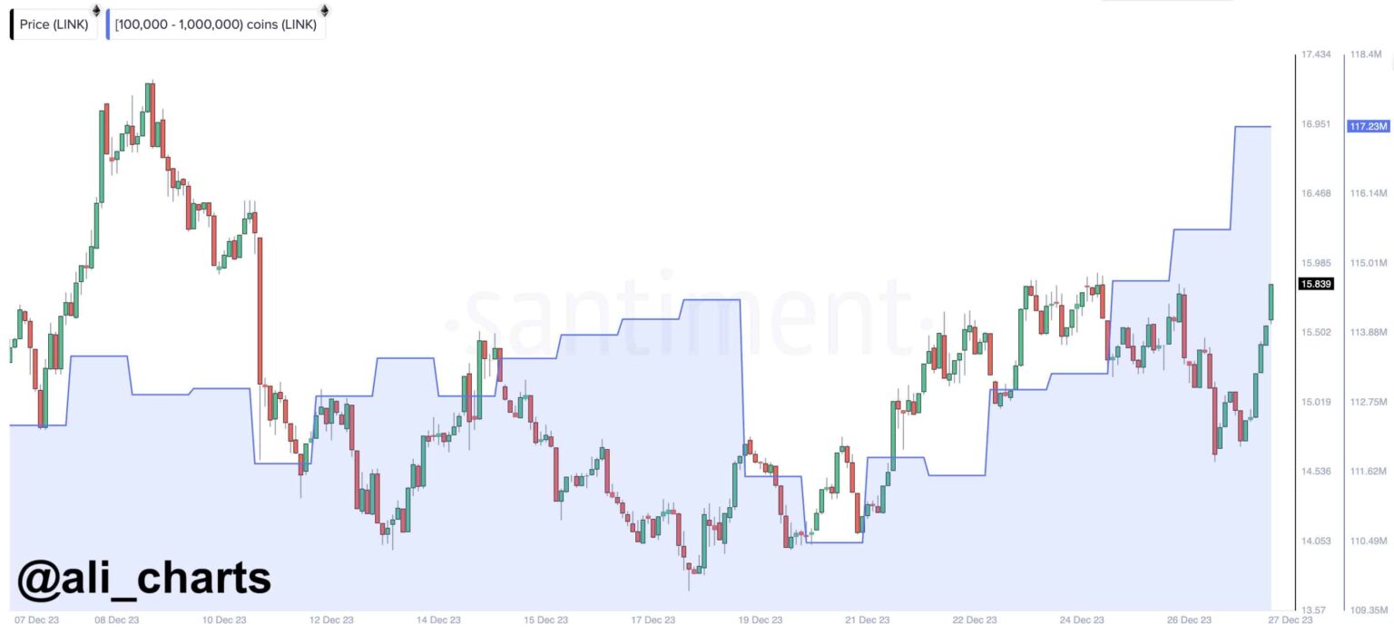 Durante la semana pasada, las ballenas Chainlink estuvieron adquiriendo grandes suministros mientras el precio de LINK se consolidaba por encima de los niveles de 14 dólares. El renombrado analista de criptografía Ali Martinez ha informado de un desarrollo significativo en el mercado de Chainlink. En el lapso de una sola semana, las ballenas asociadas con Chainlink han adquirido alrededor de 7 millones de tokens LINK, lo que representa la asombrosa cantidad de 105 millones de dólares. Esta importante actividad de compra indica un notable aumento de la confianza entre los principales actores del ecosistema Chainlink.