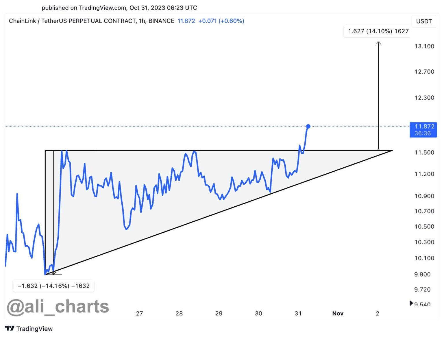 El popular analista de criptografía Ali Martinez señaló que Chainlink ha superado con éxito un patrón de triángulo ascendente en su gráfico horario. Esta formación alcista sugiere un posible aumento de precio del 14%, lo que posiblemente impulse a $LINK hacia la marca de $13.