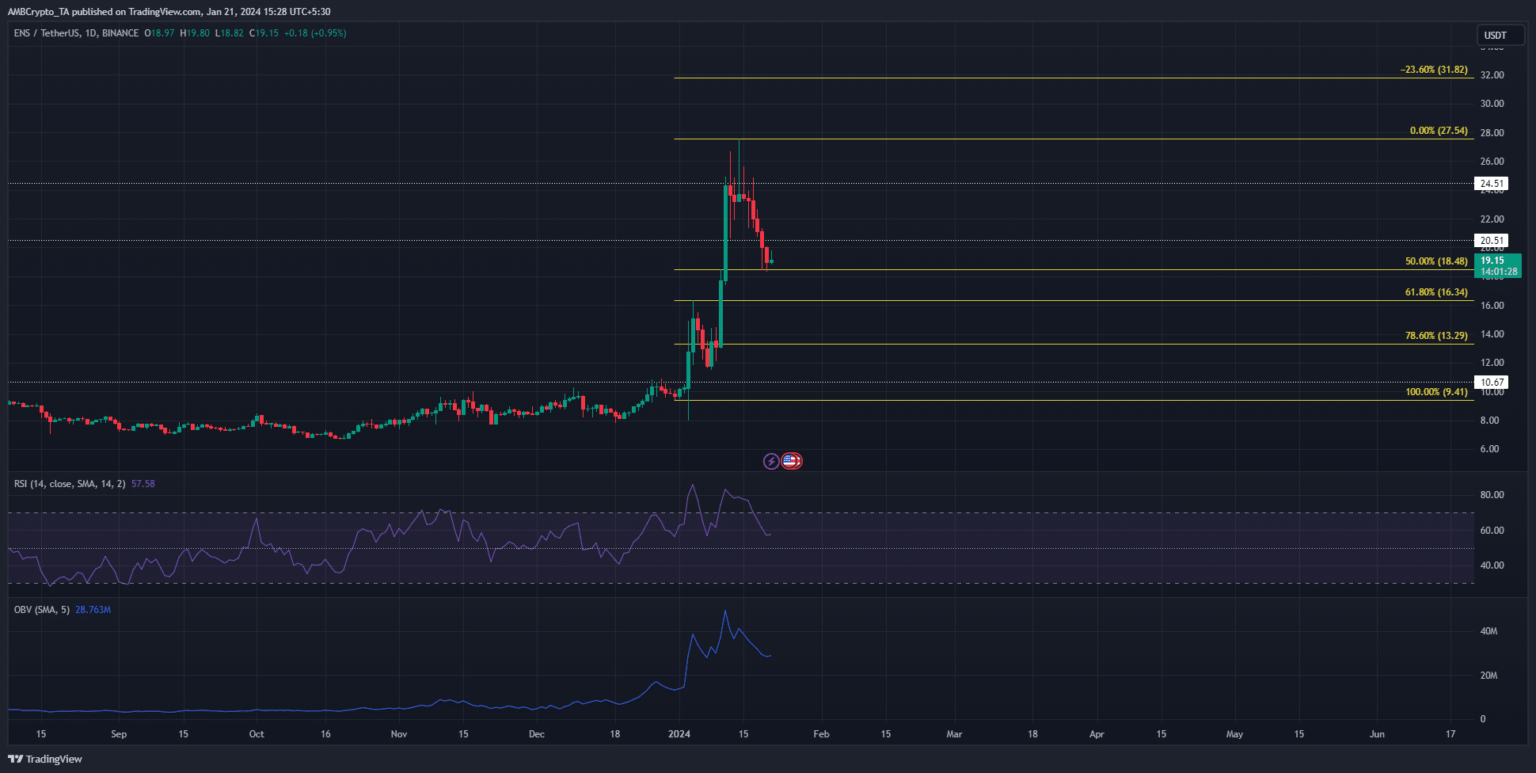 Servicio de nombres de Ethereum [ENS] ganó un 191% del 1 al 14 de enero. Subió de 9,44 dólares a 27,54 dólares, pero desde entonces ha caído a 19,15 dólares al cierre de esta edición. La reciente caída también hizo que los precios estuvieran por debajo de 20,5 dólares.