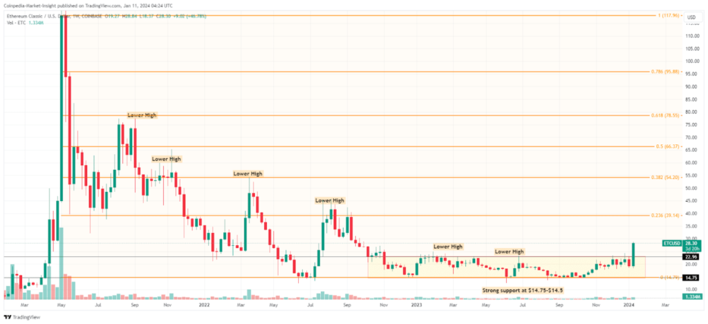 En el análisis del gráfico semanal, Ethereum Classic (ETC) ha mostrado una desviación de la formación de máximos más bajos que caracterizó la tendencia bajista anterior hasta 2022. Después de un rango de consolidación de un año a lo largo de 2023, ETC luchó por superar la resistencia de 23 dólares.