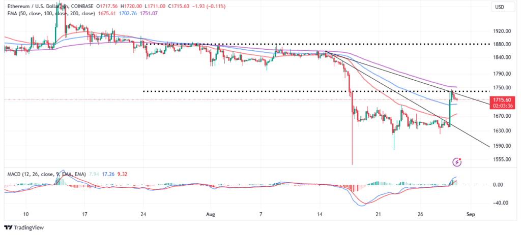 El precio de ETH reaccionó al triunfo de Grayscale Investments sobre la Comisión de Bolsa y Valores (SEC) el martes, subiendo desde el soporte de 1.630 dólares a máximos por encima de la resistencia de 1.700 dólares. Se alcanzó un nuevo máximo semanal en 1.740$ antes de que el impulso disminuyera, permitiendo el retroceso en curso en 1.715$.