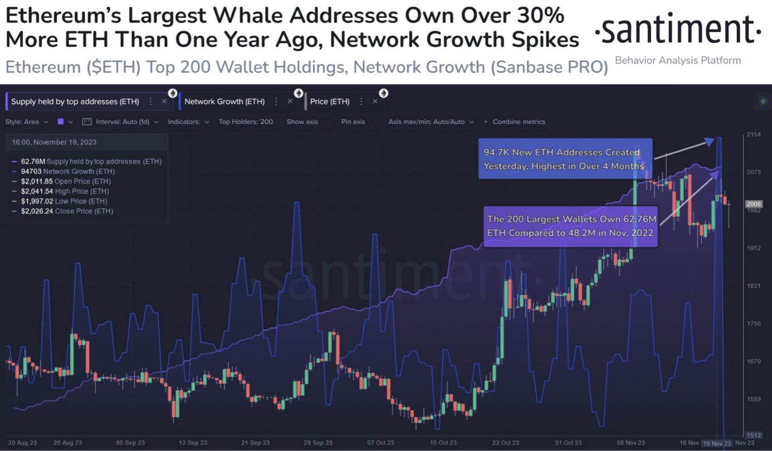 En un desarrollo reciente en el espacio Ethereum, las 200 principales billeteras Ethereum poseen colectivamente 62,76 millones de ETH, valorados en aproximadamente $124,1 mil millones. En particular, estas billeteras han acumulado un 30,3% más de monedas desde el 21 de noviembre de 2022. Además, se observó un aumento en la actividad de las billeteras Ethereum, con la notable creación de 94,7 mil nuevas billeteras ETH ayer, el aumento más sustancial desde julio.