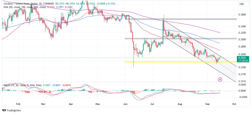 Tras el rebote desde el soporte de 0,23$, que coincidió con el límite medio de un canal descendente, los alcistas de precios de Cardano están luchando para debilitar la resistencia en el límite superior para impulsar ganancias superiores a 0,26$.