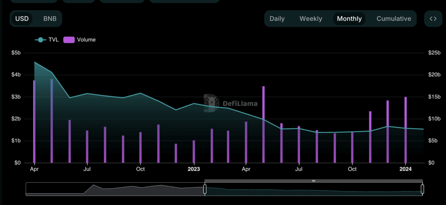 Al 31 de enero, el TVL de PancakeSwap era de 1.560 millones de dólares, lo que supone una disminución del 3% con respecto a los 1.520 millones de dólares de diciembre.