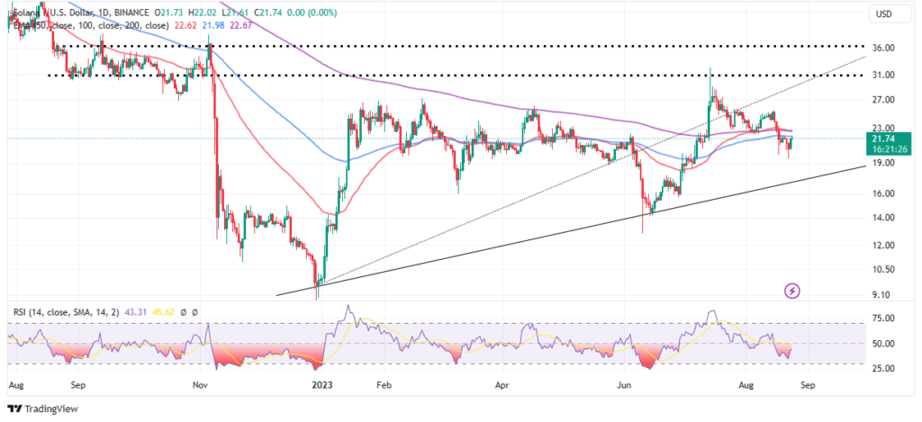Solana está en camino de una recuperación significativa tras la caída a 20 dólares. Los alcistas están listos para llevar el precio actual de $21,74 por token a la resistencia psicológica entre $30 y $32, sin embargo, primero deben lidiar con el obstáculo inmediato de $21,98, resaltado por la media móvil exponencial (EMA) de 100 días (azul).